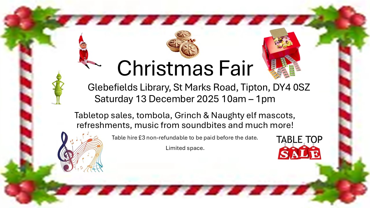 Glebefield Library, St Marks Road, Tipton, DY4 0SZ Saturday 13th December 2025 10am-1pm Tabletop sales, tombola, grinch & naughty elfs […]
